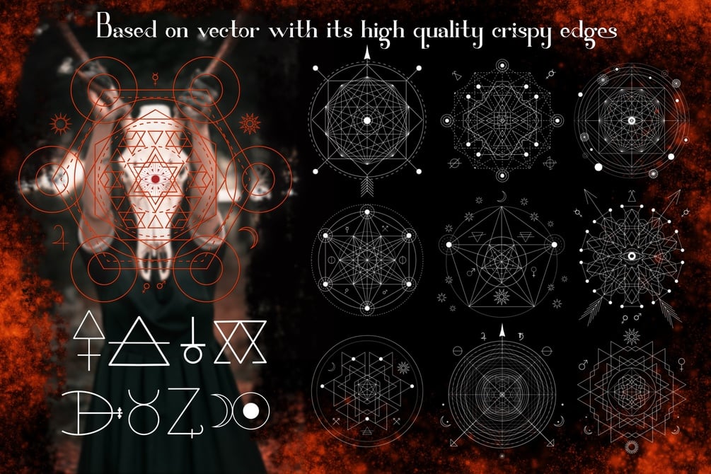 126 stamp brushes for Photoshop and Procreate, featuring elements of alchemy and sacred geometry symbols. These linear alchemy, occult, and philosophical signs are perfect for enhancing your creative projects such as music album covers, posters, flyers, and logo designs. They encapsulate concepts of astrology, imagination, creativity, superstition, and religion.