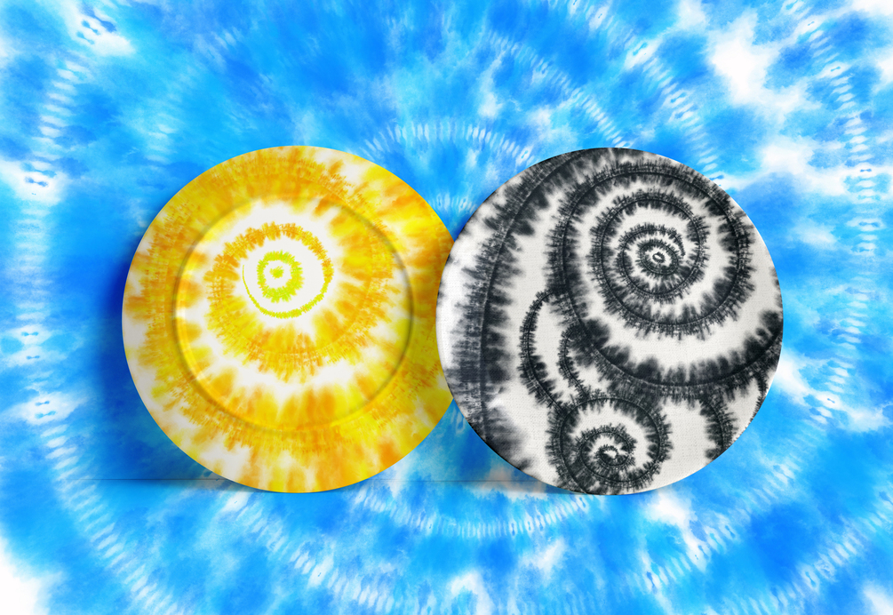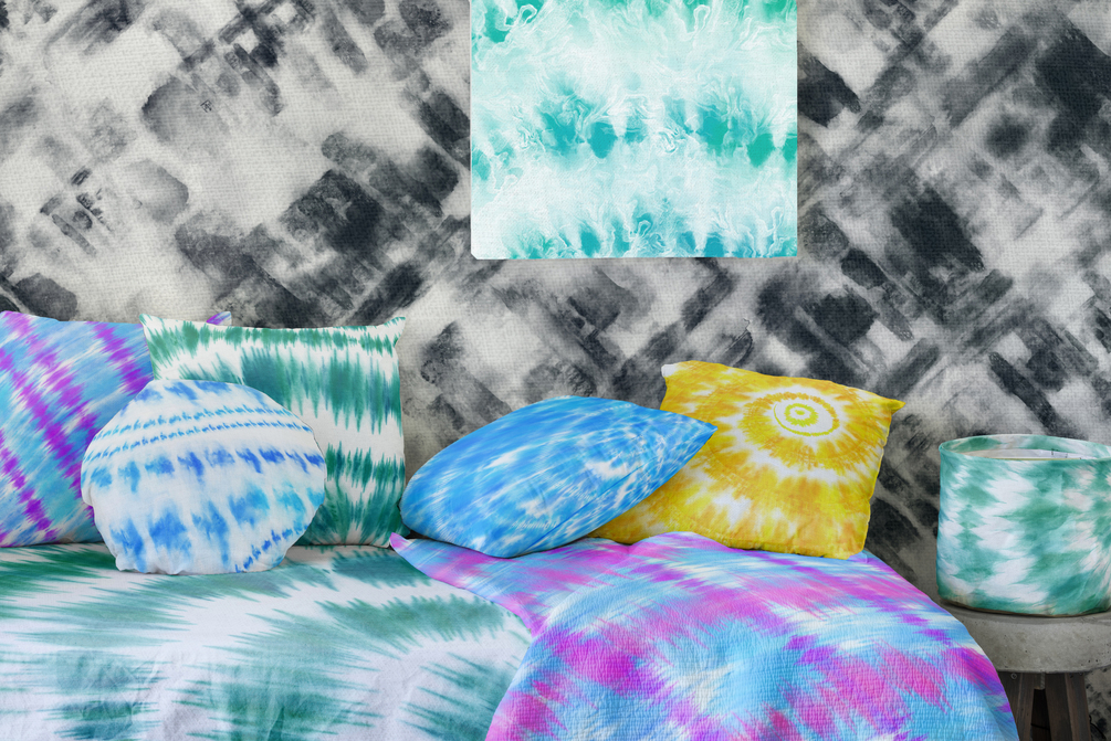 Tie-dye is a modern term invented in the mid-1960s in the United States for a set of ancient resist-dyeing techniques, and for the products of these processes. The process of tie-dye typically consists of folding, twisting, pleating, or crumpling fabric or a garment and binding with string or rubber bands, followed by application of dye(s). The manipulations of the fabric prior to application of dye are called resists, as they partially or completely prevent the applied dye from coloring the fabric. Tie-dye is characterized by the use of bright, saturated primary colors and bold patterns. Tie-dye can be used to create a wide variety of designs on fabric, from standard patterns such as the spiral, peace sign, diamond, and the marble effect to beautiful works of art. (c) https://en.wikipedia.org/wiki/Tie-dye